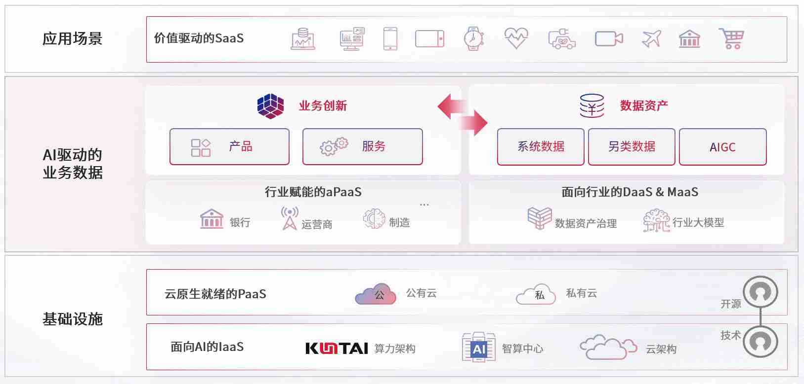 数字时代,,围绕企业数字化转型的关键要素,,,z6尊龙数码开创性的提出数云融合战略和技术体系框架,,,,着力在云原生、、数字原生、、、AI原生和信创产业上架构产品和服务能力,,,,为处在不同数字化转型阶段的快消零售、、、汽车、、、金融、、、医疗、、政企、、、、教育、、运营商等行业客户提供泛在的敏捷IT能力和融合的数据驱动能力,,,,构建跨界融合创新的数字业务场景和新业务模式,,,,助力企业级客户建立面向未来的核心能力和竞争优势,,,,全面推动社会的数字化、、智能化转型升级。。