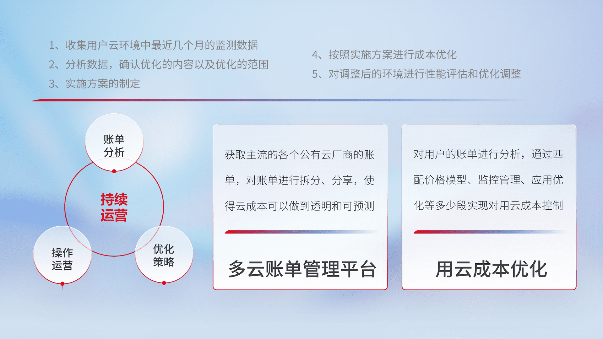 通过多云纳管,,以统一的资源数据模型把客户的云资源进行抽象和封装,,进而实现对多云资源的统一操作,,保障云资源管理的可靠性、、、稳定性与可用性。。量身定制化运维内容,,配置、、、开发运维、、补丁管理、、备份、、、监控、、、认证和访问管理、、审计和日常巡检等,,,保障在用云过程中的可靠度,,,,稳定度以及高可用率。。。